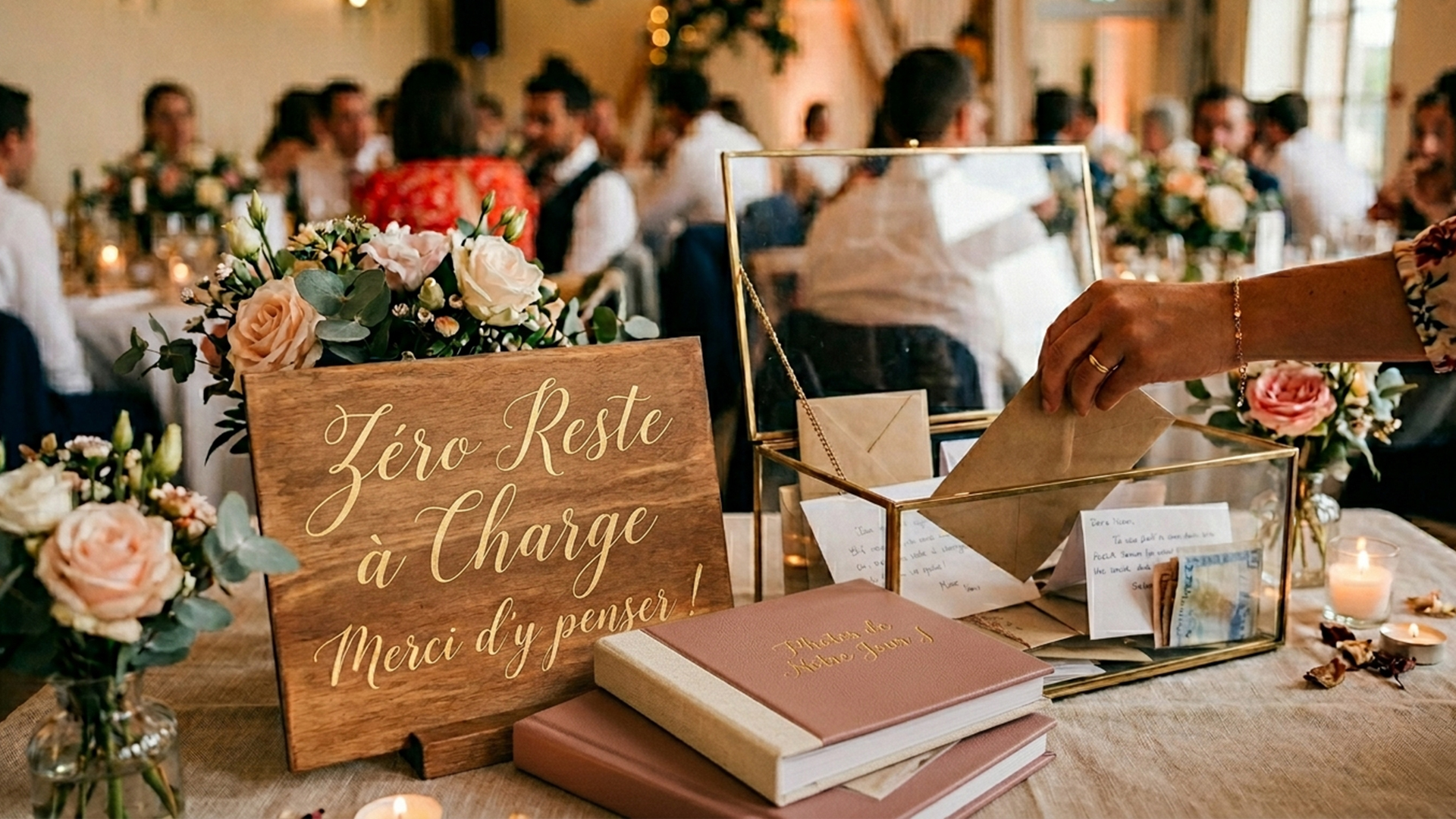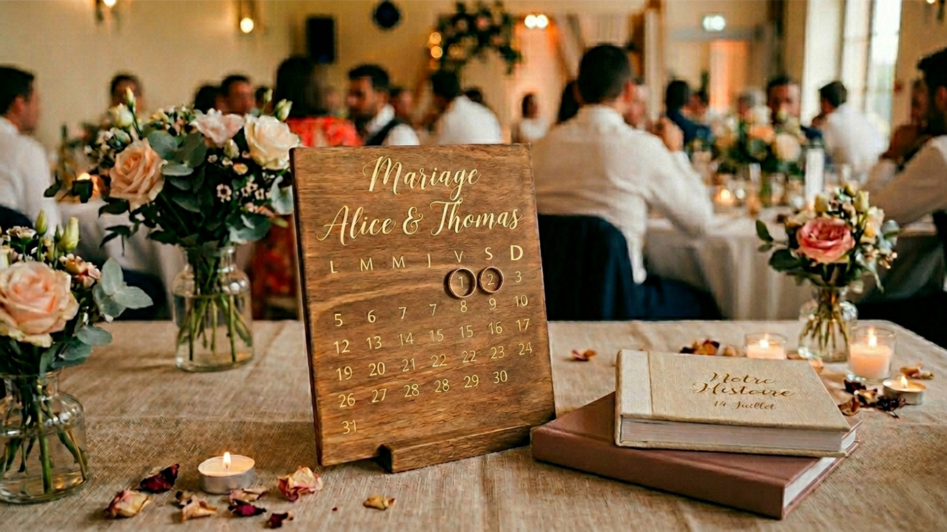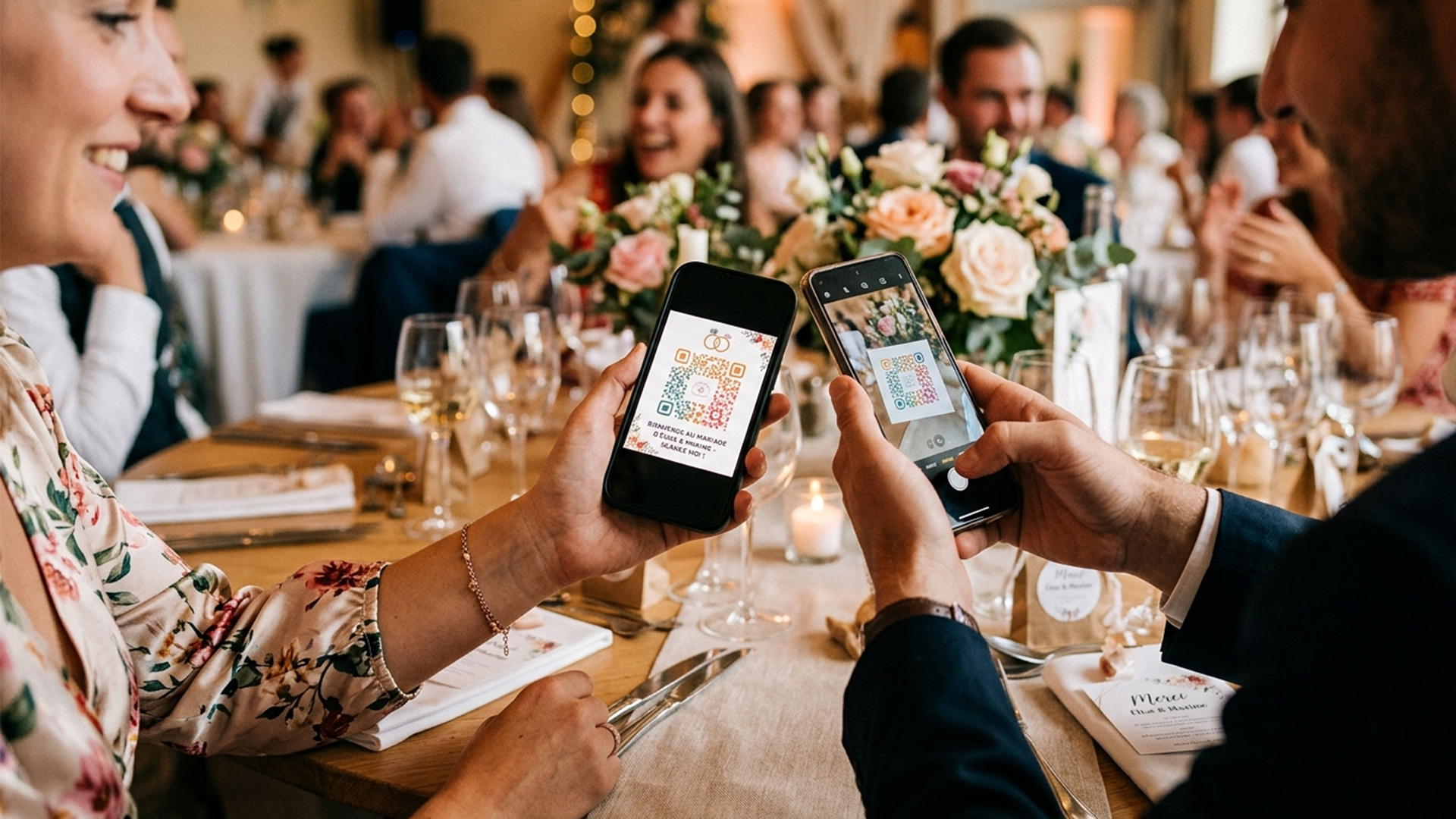 Je vous fournis un kit numérique dès votre réservation. Vous pouvez l’intégrer à vos faire-part, à votre site de mariage, ou l’imprimer sur des petits supports que je peux vous aider à disposer sur les tables le jour J.